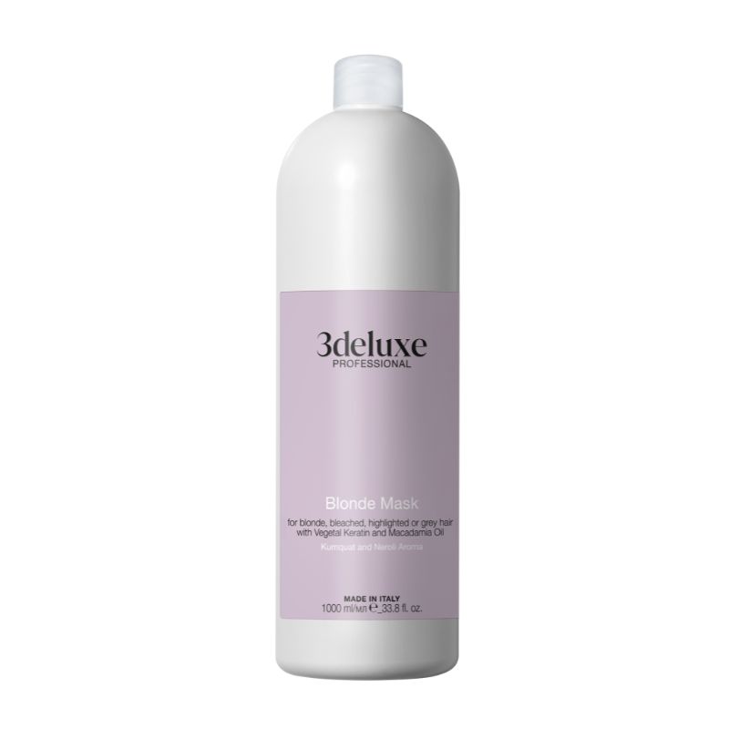 3deluxe Blonde Mask 1000 ml to profesjonalna odżywka do włosów blond, rozjaśnianych i siwych, stworzona z myślą o ochronie koloru i poprawie kondycji włosów. Formuła neutralizuje niepożądane żółte i ciepłe tony, przywracając chłodny, jasny odcień oraz zdrowy połysk.