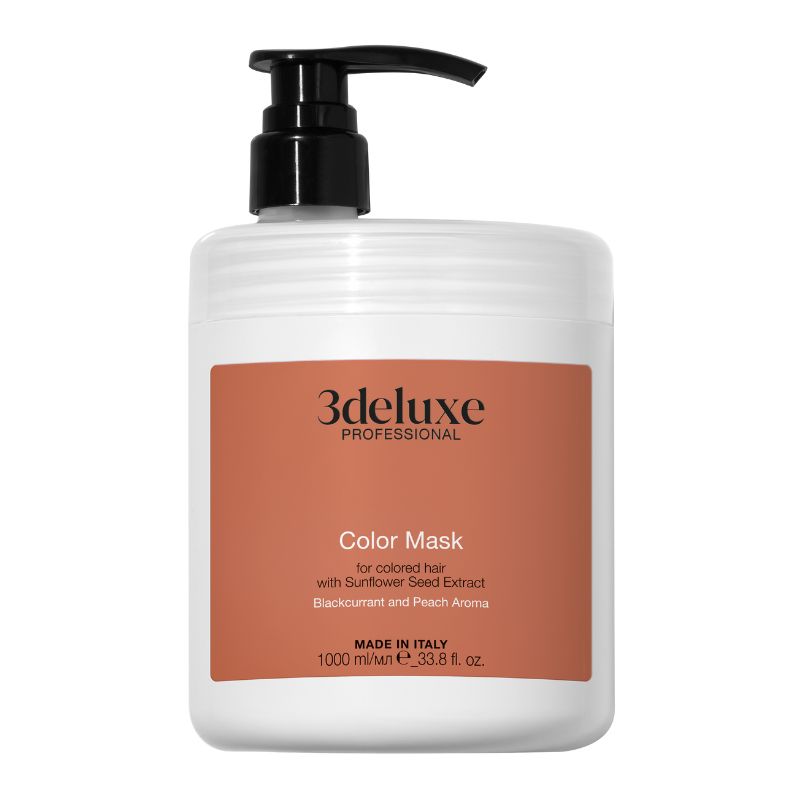 3deluxe Color Mask to profesjonalna maska do włosów farbowanych, stworzona z myślą o ochronie i przedłużeniu trwałości koloru. Jej bogata, odżywcza formuła intensywnie nawilża i regeneruje włosy, jednocześnie zabezpieczając pigment przed wypłukiwaniem. Zawarty w formule ekstrakt z pestek słonecznika, bogaty w witaminę A, odżywia włosy, nadaje im połysk oraz wspiera ochronę intensywności koloru. Maska przywraca miękkość, gładkość i naturalny blask, ułatwia rozczesywanie oraz poprawia elastyczność włosów. Delikatny zapach czarnej porzeczki i brzoskwini podkreśla jej pielęgnacyjny charakter. Wegańska formuła. Duża pojemność 1000 ml sprawia, że produkt doskonale sprawdza się w profesjonalnych salonach fryzjerskich. Najważniejsze cechy produktu: